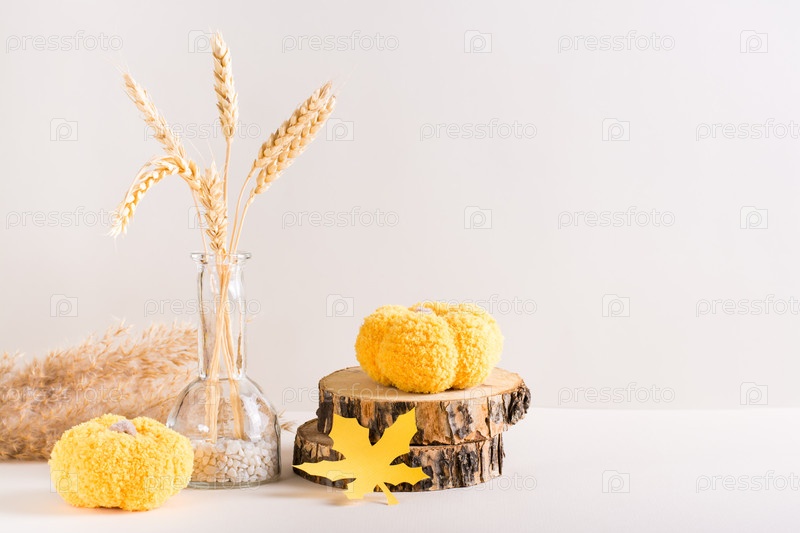 Осенний эко-дизайн из вязаных тыкв, бумажных листьев, ствола дерева и колосьев на светлом фоне