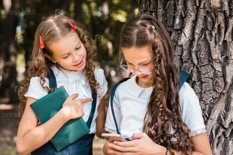 Одноклассники в школьной форме с книгой смотрят на смартфон в теплый день в парке