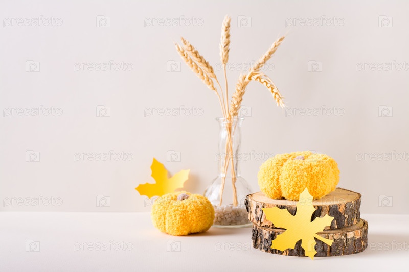 Вязаная тыква на стволе дерева, бумажные кленовые листья и ушки в бутылке. Осеннее украшение