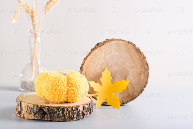 Осеннее украшение. Вязаная тыква на срезе дерева и бумажные кленовые листья на светлом фоне