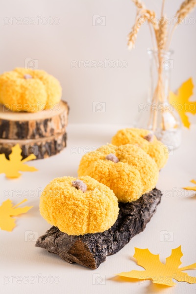 Вязаные тыквы на коре дерева и бумажных кленовых листочках. Осеннее украшение своими руками. Вертикальный вид