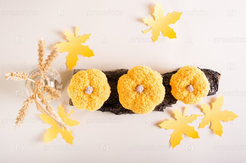 Вязаные тыквы на коре дерева, бумажных кленовых листьях и ушках. Осеннее украшение своими руками. Вид сверху