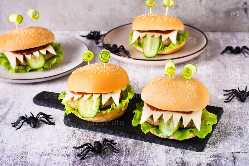 Домашние бургеры-монстры с глазами и языком для меню хэллоуина на доске и пауки на столе