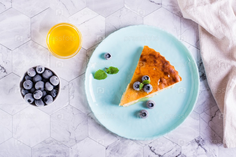 Аппетитный тонкий чизкейк с медом и черникой на тарелке. Домашняя выпечка. Вид сверху