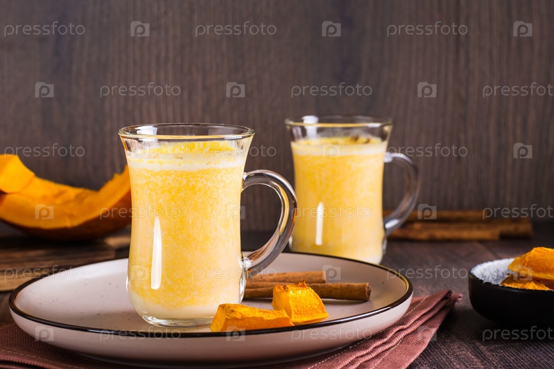 Латте из тыквы в стаканах и кусочки тыквы в миске на деревянном столе. Домашние осенние напитки