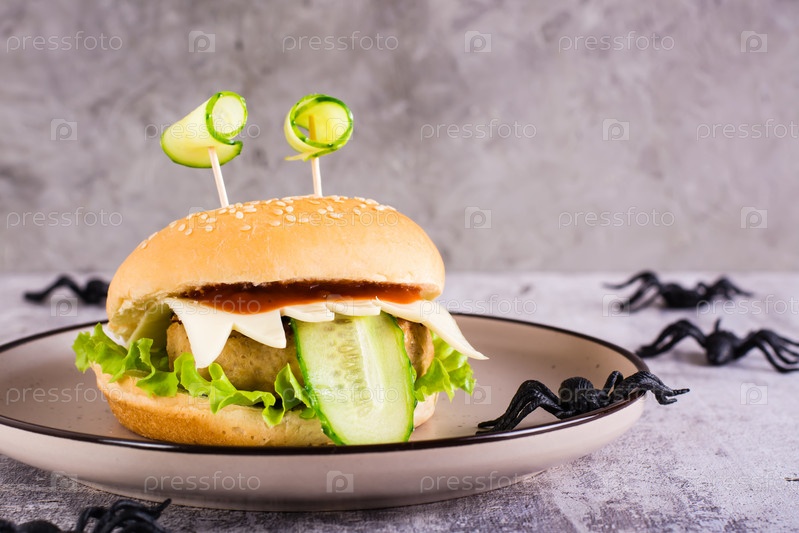 Креативный бургер-монстр с глазами и языком для меню хэллоуина на тарелке и пауки на столе