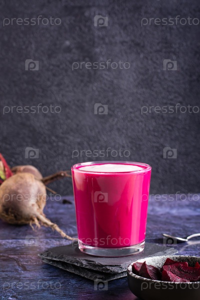 Овощной свекольный латте в стаканах на столе. Альтернатива кофе. Вертикальный вид