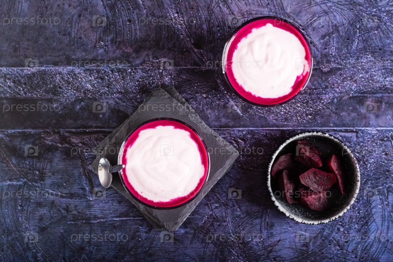Овощной свекольный латте в стаканах на столе. Альтернатива кофе. Вид сверху