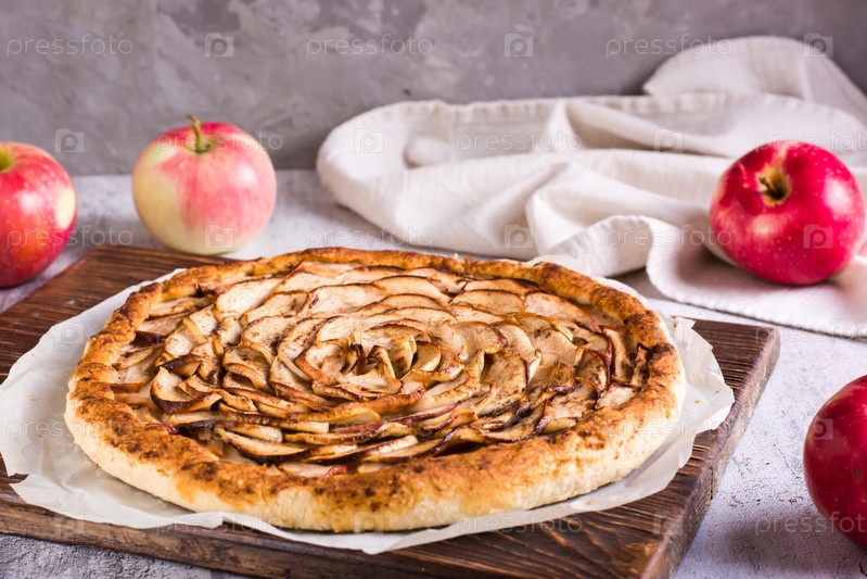 Запеченный яблочный пирог на бумаге для выпечки на столе. Домашняя выпечка