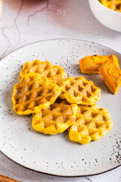 Домашние бельгийские тыквенные вафли на тарелке на столе. Осенняя выпечка. Вертикальный вид крупным планом