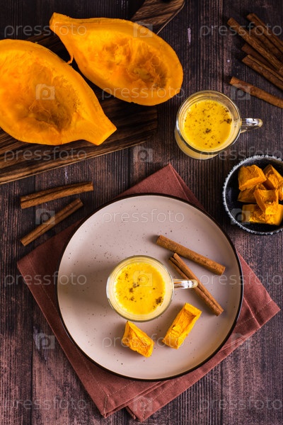 Осенний домашний тыквенный латте с корицей в стаканах и кусочками тыквы. Верхний и вертикальный вид