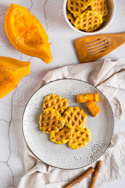Бельгийские домашние тыквенные вафли на тарелке на столе. Осенняя выпечка. Верхний и вертикальный вид
