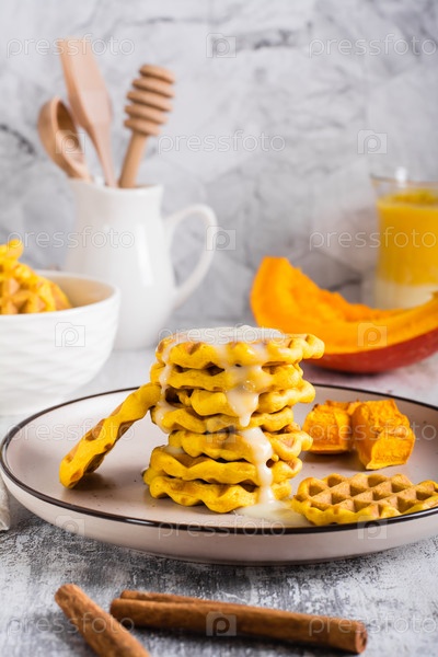 Стопка бельгийских домашних тыквенных вафель со сладким соусом на тарелке. Вертикальный вид