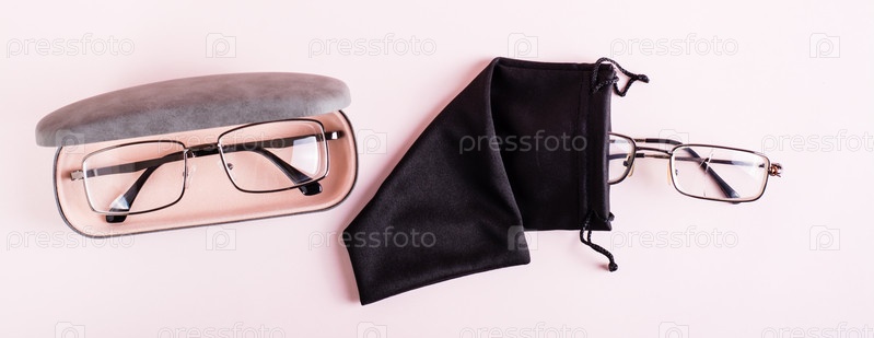Концепция хранения – разбитые очки в мягком футляре и целые очки в жестком футляре. Вид сверху. Веб-баннер