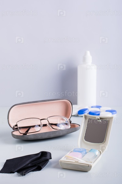 Выбор между очками и контактными линзами. Предметы ухода и хранения. Вертикальный вид