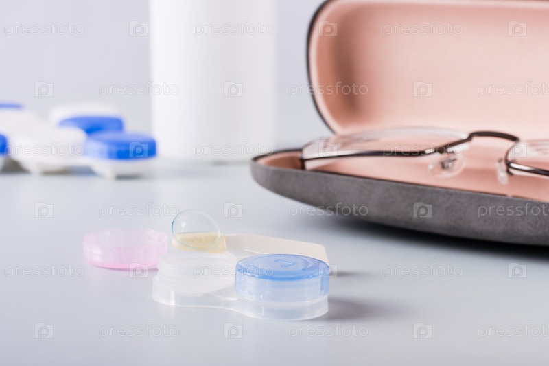 Контактные линзы на открытом контейнере для хранения на фоне футляра с очками