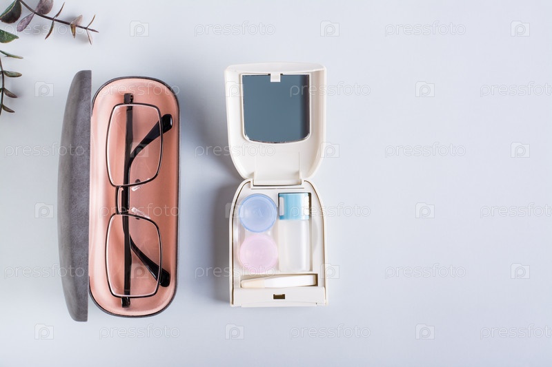 Очки в футляре и набор для контактных линз на синем. Выбор метода коррекции зрения