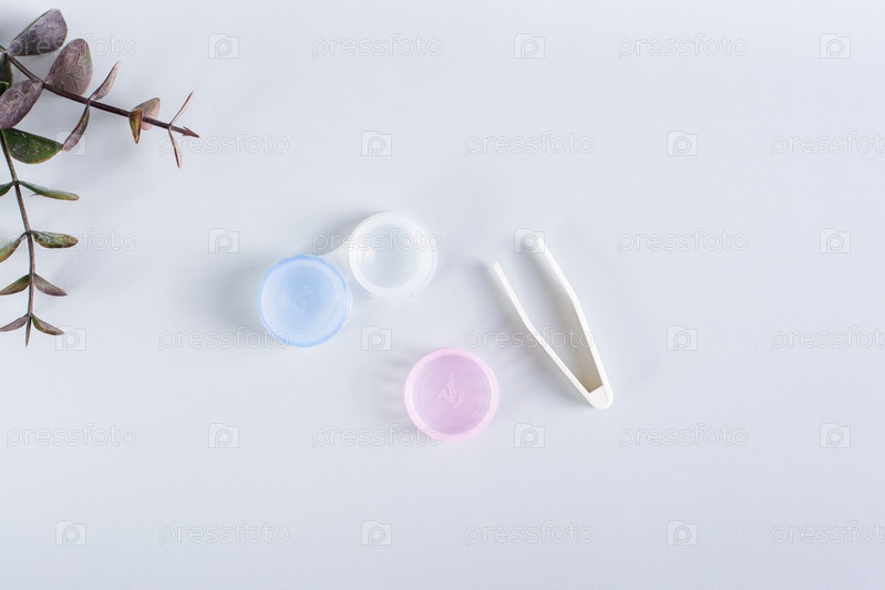 Открытый контейнер с контактными линзами и пинцетом на синем фоне. Вид сверху