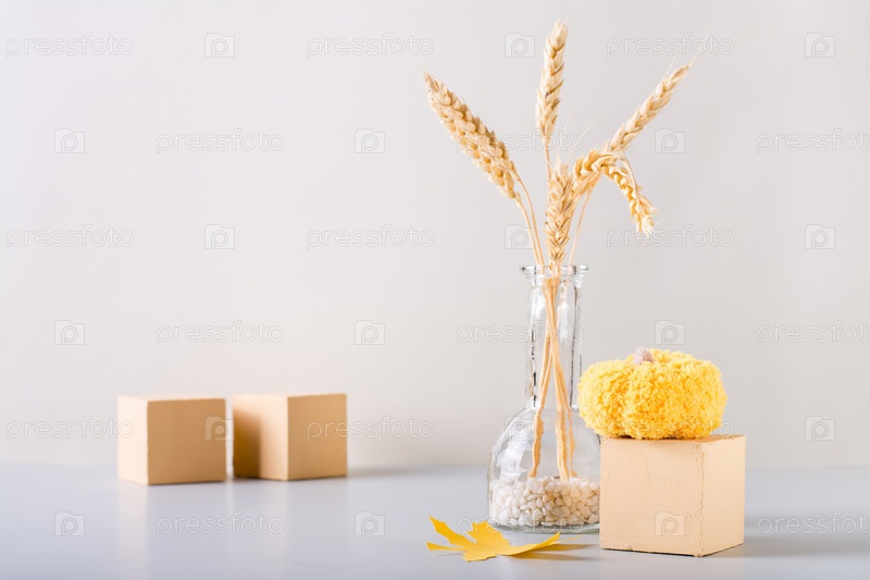Осеннее украшение. Вязаная тыква на кубике и колосья пшеницы в бутылке на светлом фоне