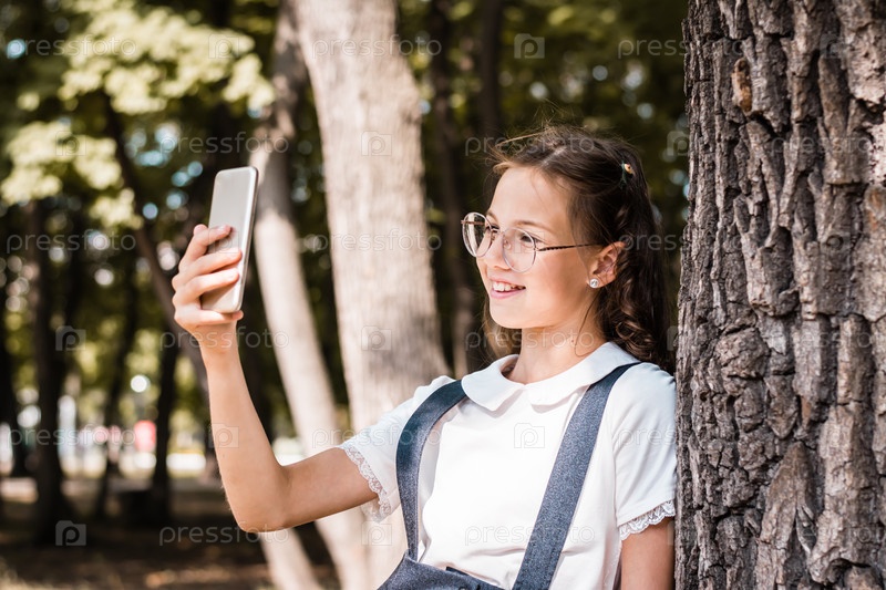 Школьница в очках делает селфи на смартфоне возле дерева в парке