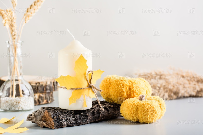 Осеннее украшение. Свеча на коре дерева, вязаная тыква и бумажные кленовые листья на светлом фоне