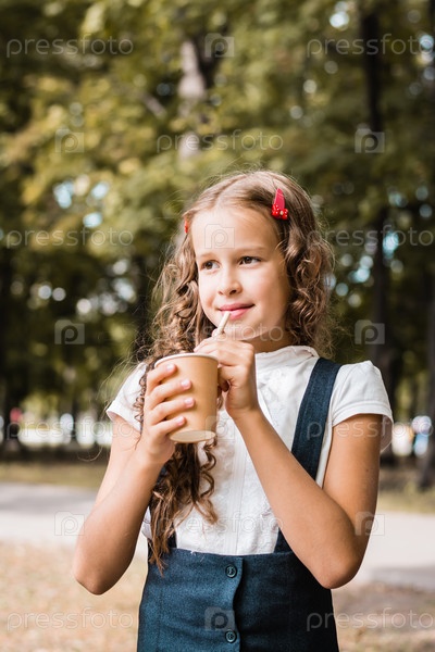 Школьница пьет из экологически чистой чашки и соломы в парке. Вертикальный вид
