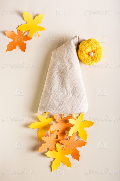 Осеннее украшение. Образ гнома из тканевой шапки, бумажных листьев и тыквы