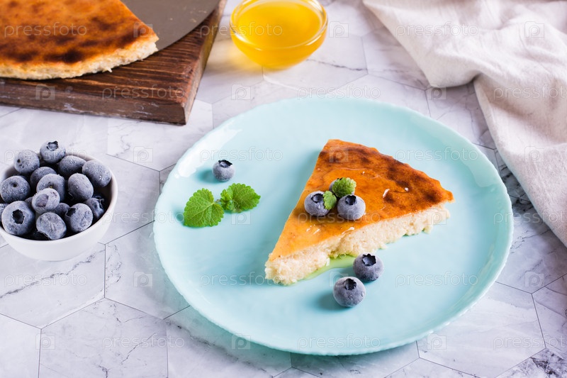 Кусок чизкейка с медом и черникой на тарелке на столе. Домашняя выпечка