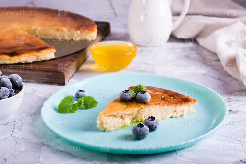 Аппетитный тонкий чизкейк с медом и черникой на тарелке на столе. Домашняя выпечка