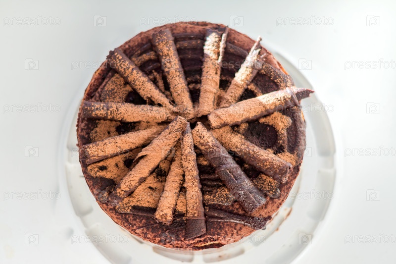 Шоколадный торт на белом фоне, вид сверху. Сладкая выпечка