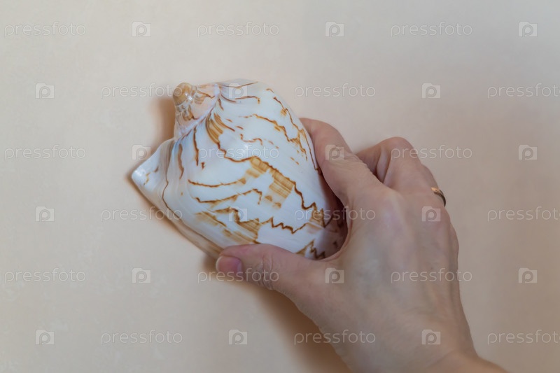 Женщина держит в руке большую морскую ракушку, украшение стен