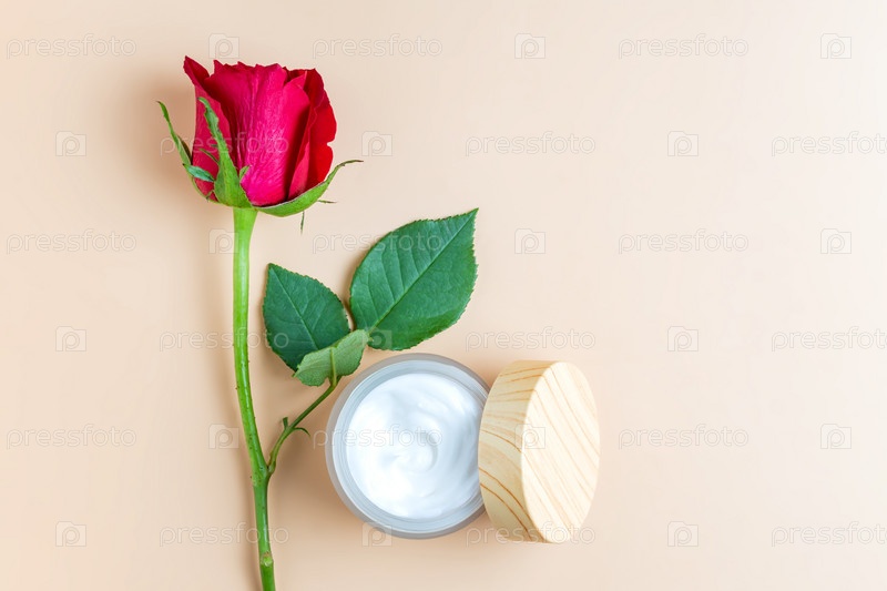 Открытая банка с кремом для лица или тела с красной розой на бежевом фоне. Презентация антивозрастной косметики по уходу за кожей