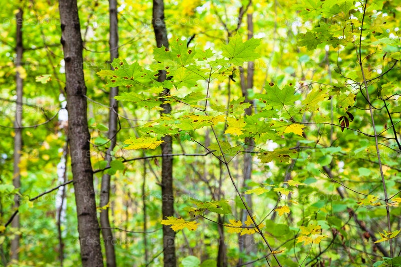 Веточки с зелеными и желтыми кленовыми листьями в лесу