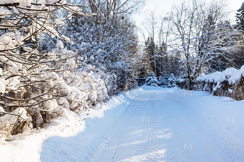 Снежная проселочная дорога между живой изгородью в деревне