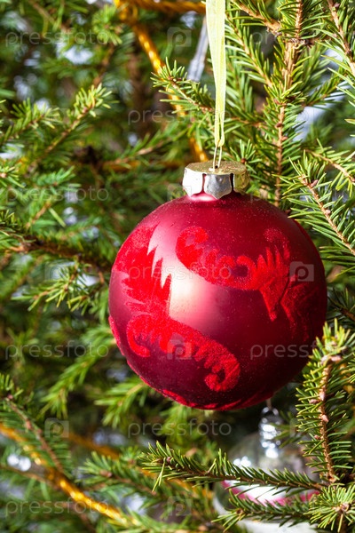 Украшенный красный шар на натуральной елке
