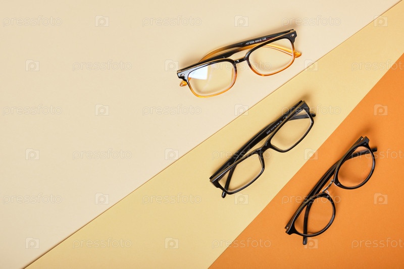 Несколько пар очков на бежевом и коричневом фоне, геометрический фон
