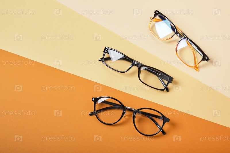 Несколько пар очков на бежевом и коричневом фоне, геометрический фон