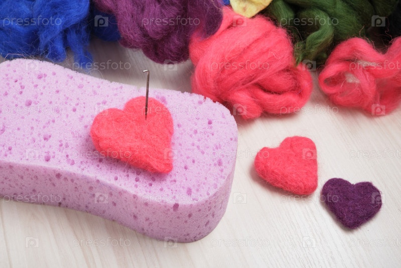 Сердечки из шерсти, иглы для валяния, губка и мотки шерсти, процесс валяния из шерсти