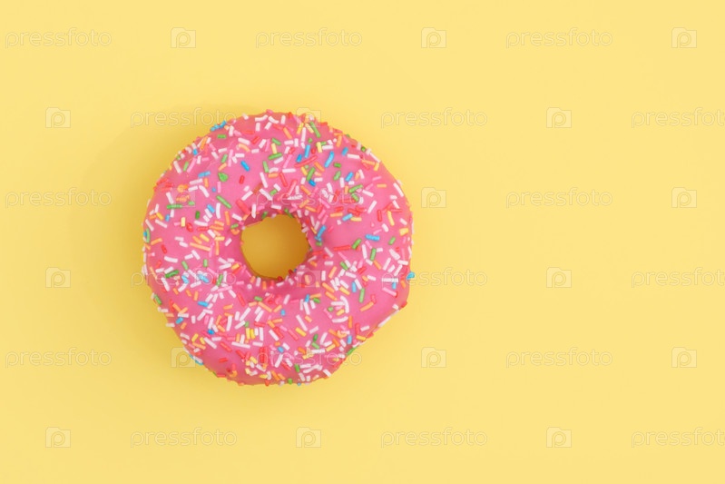 Пончик с розовой глазурью и кондитерскими посыпками на желтом фоне