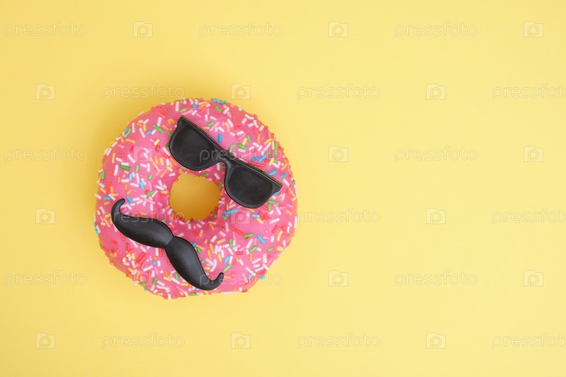 Пончик с посыпкой и розовой глазурью, пончик с усами и очками, забавная минималистичная концепция еды, желтый фон