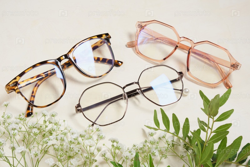 Несколько модных очков и цветов на бежевом фоне копируют пространство вид сверху