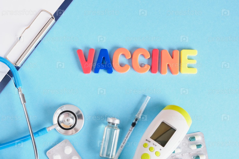 Надпись вакцина из пластиковых букв и медицинских инструментов на синем фоне, вид сверху