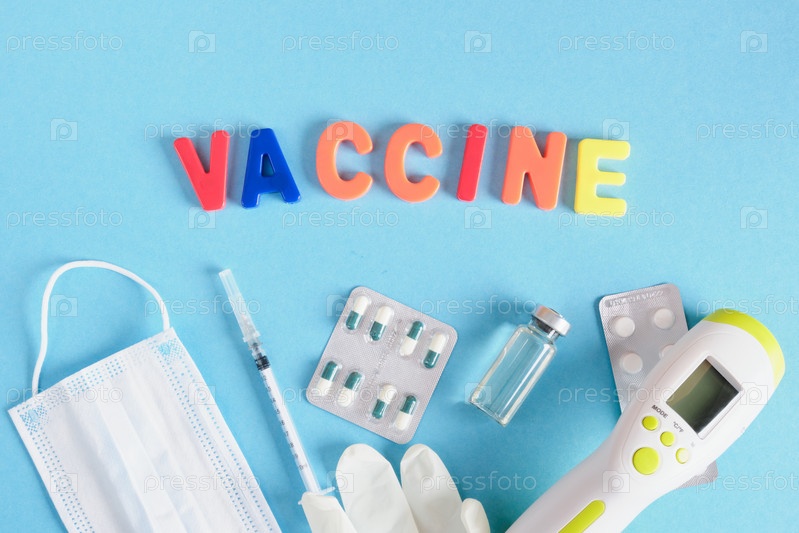 Надпись вакцина из пластиковых букв и медицинских инструментов на синем фоне, вид сверху