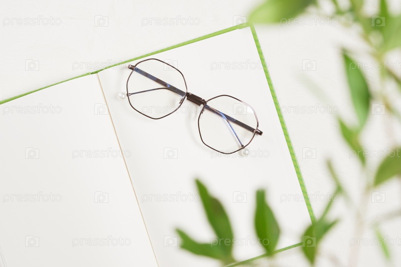 Модный современный блокнот в очках и ветка с маленькими зелеными листьями на светлом фоне копией пространства, концепция летнего и весеннего настроения