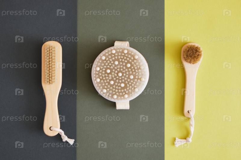 Деревянная антицеллюлитная щетка с натуральной щетиной для сухого массажа тела и лица зеленый геометрический фон. Лимфодренажный и отшелушивающий массаж. экологически чистый и безотходный образ жизни