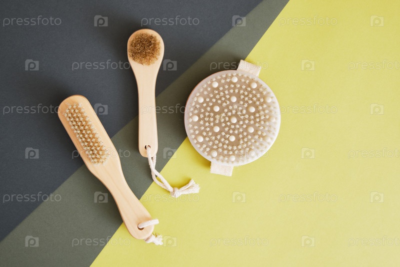Деревянная антицеллюлитная щетка с натуральной щетиной для сухого массажа тела и лица зеленый геометрический фон. Лимфодренажный и отшелушивающий массаж. экологически чистый и безотходный образ жизни
