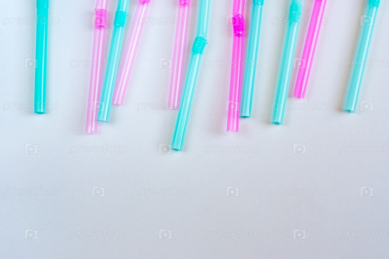Синие, розовые соломинки для коктейлей и других напитков на белом фоне