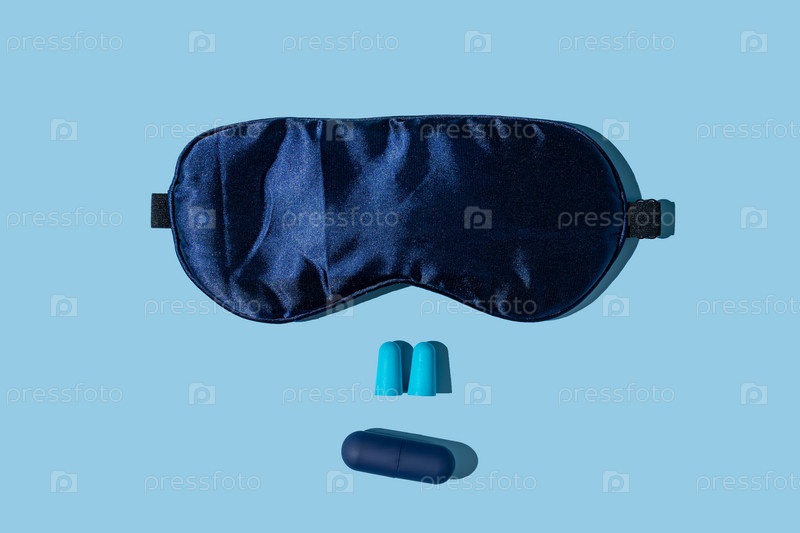 Концепция хорошего сна - синяя маска для сна и беруши с индивидуальным контейнером для капсул на синем фоне