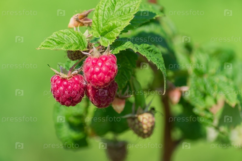 Крупный план малинового куста с красными ягодами на зеленом фоне