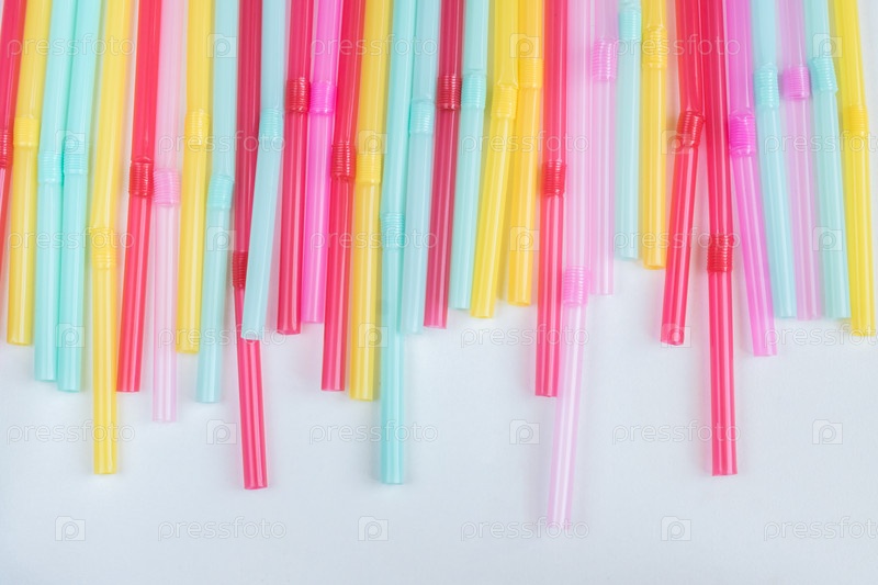 Синие, розовые и желтые соломинки для коктейлей и других напитков на белом фоне